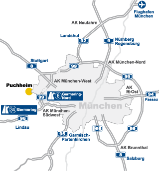Die A96 bis Kreuz München Südwest auf A99 Richtung Nürnberg/Stuttgart durch den Tunnel nehmen. Bei der Ausfahrt München-Lochhausen fahren Sie rechts Richtung Gröbenzell und biegen nach ca. 2,5 km links Richtung Puchheim ab. Nach ca. 1,5 km an der ersten Ampel links und im darauf folgenden Kreisverkehr nochmals links Richtung Gewerbegebiet-Nord. Am 2. Kreisverkehr die 2. Ausfahrt nehmen, dahinter befindet sich nach ca. 500 Meter rechts die Boschstraße.